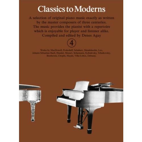 Dieses Buch Classics To Moderns ist der vierte Band der Reihe, wurde von Denes Agay zusammengestellt und herausgegeben und eignet sich für Pianisten, die auf dem Niveau der Klasse 4 arbeiten.