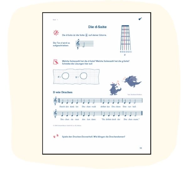 Im ersten Band für die Gitarre lernen die Kinder nicht nur die Handhabung der Gitarre und machen erste Gehversuche in der Notenschrift, begleitend dazu werden zu jeder Übung kleine Stücke gespielt.