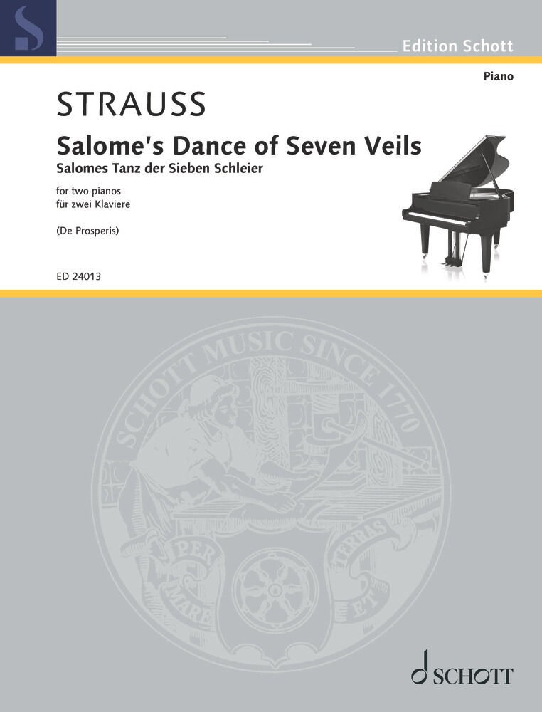 Salome’s Dance of Seven Veils, the famous orchestral dance from Richard Strauss’ opera Salome, has been newly arranged for two pianos by Marco De Prosperis. The arrangement captures the drama, intensity, and colour of the original orchestration, translating the musical dialogue between orchestral sections into a dynamic exchange between two pianists.