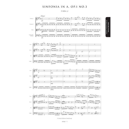 Franz Beck (1734-1809), the most talented of Johann Stamitz’s pupils, led a colourful and eventful life. Fleeing Mannheim after fighting a duel with a jealous rival, he moved to Venice. After eloping with his patron’s daughter, he finally ended up in France where he lived for nearly fifty years. Beck’s symphonies have long been admired by scholars for their technical resource, startling use of bold harmonies and dramatic intensity. Dating from the mid-1750s, the Op.1 symphonies are small in scale but very impressive in effect, ideal works for string ensembles in search of fresh and exciting repertoire.