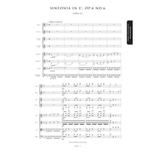 Franz Beck (1734-1809), the most talented of Johann Stamitz’s pupils, led a colourful and eventful life. Fleeing Mannheim after fighting a duel with a jealous rival, he moved to Venice. After eloping with his patron’s daughter, he finally ended up in France where he lived for nearly fifty years. Beck’s symphonies have long been admired by scholars for their technical resource, startling use of bold harmonies and dramatic intensity. In spite of their increased size and complexity Becks’s Op.4 symphonies, composed in the late 1750s and the last of his symphonies to be published as a set, share a strong kinship with his earlier symphonies while greatly expanding their musical horizons.