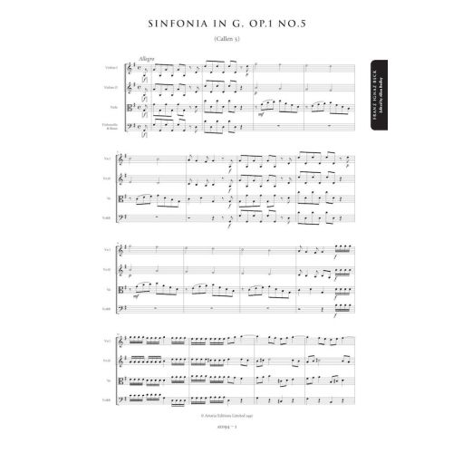 Franz Beck (1734-1809), the most talented of Johann Stamitz’s pupils, led a colourful and eventful life. Fleeing Mannheim after fighting a duel with a jealous rival, he moved to Venice. After eloping with his patron’s daughter, he finally ended up in France where he lived for nearly fifty years. Beck’s symphonies have long been admired by scholars for their technical resource, startling use of bold harmonies and dramatic intensity. Dating from the mid-1750s, the Op.1 symphonies are small in scale but very impressive in effect, ideal works for string ensembles in search of fresh and exciting repertoire.