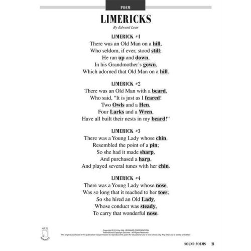 Enjoy more interactive listening and reading fun with Sound Poems! Give your students the opportunity to experience classic poetry, famous speeches and documents of history like never before! These 18 reproducible poems contain highlighted words that, when read, indicate special instrumental sounds and rhythmic motifs are to be played by your students. If you don't have all the instruments suggested, substitute or consider body percussion. There are many choices to create your presentation. The teaching suggestions provide a framework for instruction, but can be manipulated to best fit your students' abilities. The enclosed CD-ROM offers projectable and printable options. You can read the poem or select several of your students to read. And don't forget about the possibility of acting out these poems. It will only make the experience richer for your students as well as add a lot of enjoyment. Doesn't this sound like fun? You bet! 18 Poems including: Daddy Fell into the Pond, The Spider and the Fly, The Night Before Christmas, Jolly Old Saint Nicholas, Marching Song, Two Little Kittens, The Land of Nod, Limericks, The Hare and the Tortoise, and more! Suggested for grades K-5.