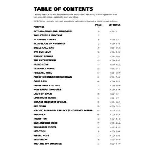 A great collection of banjo classics, including: Alabama Jubilee, Bye Bye Love, Duelin' Banjos, The Entertainer, Foggy Mountain Breakdown, Great Balls of Fire, Lady of Spain, Rawhide, (Ghost) Riders in the Sky (A Cowboy Legend), Rocky Top, San Antonio Rose, Tennessee Waltz, UFO-TOFU, You Are My Sunshine, and more.